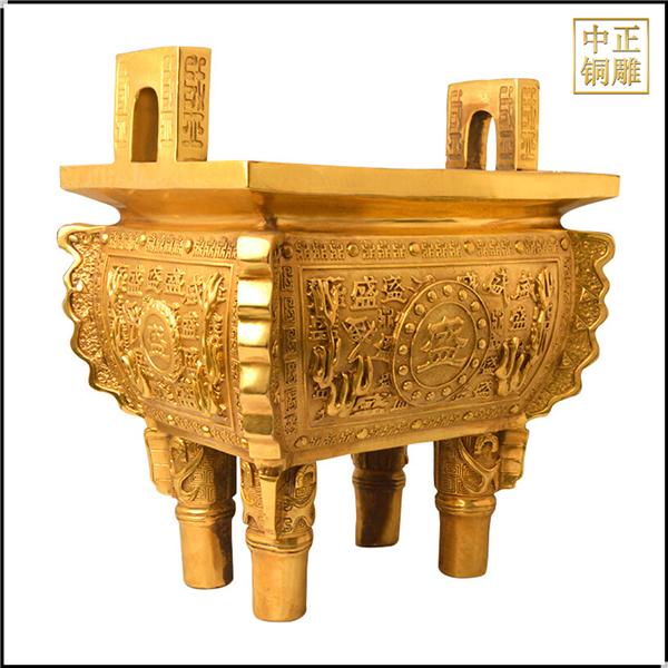 铜鼎做为青铜器中的重器,一直是人们心中认为的重要的青铜器作品,它有一种历史的份量,这无形中就表达出了一种厚重之感。尤其是在现代企业雕塑中,应用也是很广泛。参观过历史博物馆的人,总会被一些大小不同,形制相异的青铜器所吸引,这些青铜器多数是由地下发掘出来的,有些出自墓葬,有些出自遗址或窖藏,其中少数是传世品。这些青铜器物不仅仅是历史的产物,更是体现中国文化的一部分。中正铜雕-聚宝方鼎铸造、聚宝方鼎铸造价格、聚宝方鼎铸造厂家,我厂是一家以设计、制作、安装为一体的发展型企业。公司坐落在中国铜雕之乡---河北唐县,成立于1984年。公司自成立以来,以优质的雕塑工艺,优异的性价比,一体化的销售网络,高效、完善的售后服务,飞速发展。成为了拥有设计、销售、生产、安装、维护为一体的铜雕塑制作商。