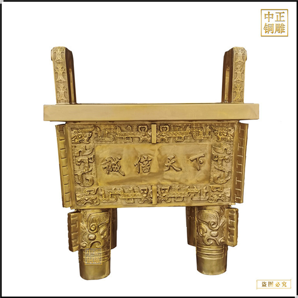 在实践中,现代企业青铜鼎的主要目的是彰显企业文化。“鼎”用来表达“团结、文化、诚信”等企业精神。企业青铜鼎可以分为两类,一类是传统的青铜鼎,和其他青铜鼎没什么区别。它是用青铜铸造的,建造的青铜雕塑有古朴、厚重、历史等感觉。