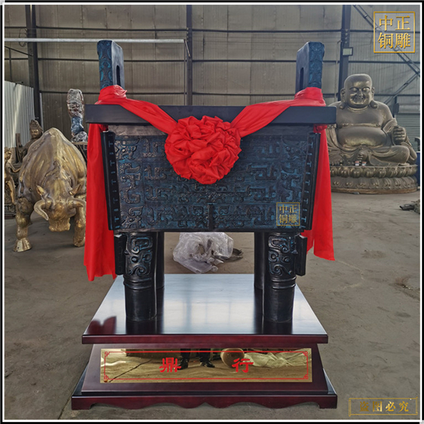 扁足鼎,传世,出土极少。足形分龙形和鸟形两种,以龙形最多;形状大小不一,但大部分都很小。兽面扁足鼎是较大的那种,有耳,方唇,腹浅底平,下有三条龙形平足。每只平足的薄边和宽边都有密集而雄浑的龙纹。除了突出龙头的特征外,身上还有鳞片,象征着龙的林。龙尾斜卷成落地支撑点,使整个鼎感觉稳定,从而增强了造型的气势。